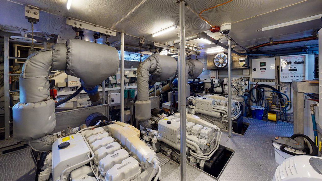 The engine room itself is very large and roomy, again with nearly eight feet of headroom. Her engines and contained mechanical systems are readily accessible for proper regular maintenance; and she has been maintained in top condition since she was first commissioned.